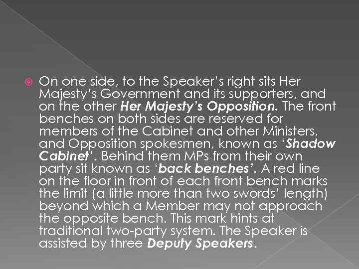 On one side, to the Speaker’s right sits Her Majesty’s Government and its supporters, and on the other Her Majesty’s Opposition. The front benches on both sides are reserved for members of the Cabinet and other Ministers, and Opposition spokesmen, known as ‘Shadow Cabinet’. Behind them MPs from their own party sit known as ‘back benches’. A red line on the floor in front of each front bench marks the limit (a little more than two swords’ length) beyond which a Member may not approach the opposite bench. This mark hints at traditional two-party system. The Speaker is assisted by three Deputy Speakers.