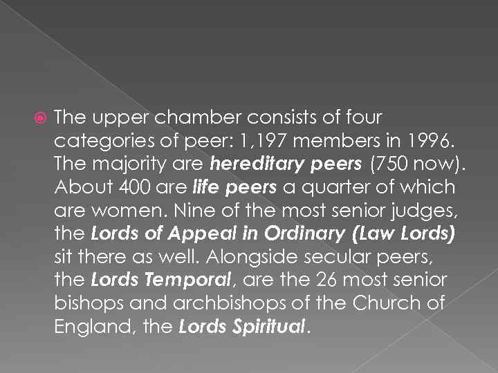 The upper chamber consists of four categories of peer: 1, 197 members in 1996. The majority are hereditary peers (750 now). About 400 are life peers a quarter of which are women. Nine of the most senior judges, the Lords of Appeal in Ordinary (Law Lords) sit there as well. Alongside secular peers, the Lords Temporal, are the 26 most senior bishops and archbishops of the Church of England, the Lords Spiritual.