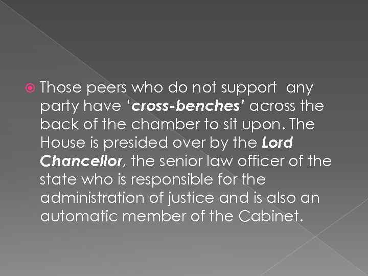 Those peers who do not support any party have ‘cross-benches’ across the back of the chamber to sit upon. The House is presided over by the Lord Chancellor, the senior law officer of the state who is responsible for the administration of justice and is also an automatic member of the Cabinet.