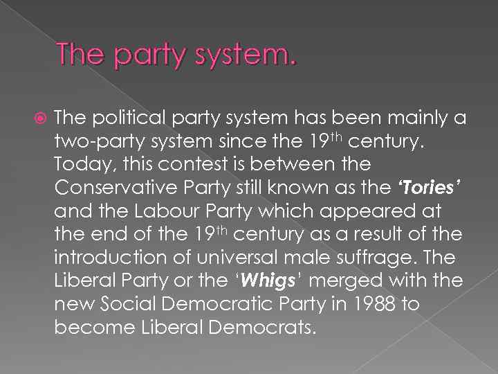 The party system. The political party system has been mainly a two-party system since the 19 th century. Today, this contest is between the Conservative Party still known as the ‘Tories’ and the Labour Party which appeared at the end of the 19 th century as a result of the introduction of universal male suffrage. The Liberal Party or the ‘Whigs’ merged with the new Social Democratic Party in 1988 to become Liberal Democrats.