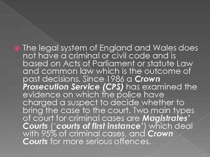 The legal system of England Wales does not have a criminal or civil code and is based on Acts of Parliament or statute Law and common law which is the outcome of past decisions. Since 1986 a Crown Prosecution Service (CPS) has examined the evidence on which the police have charged a suspect to decide whether to bring the case to the court. Two main types of court for criminal cases are Magistrates’ Courts (‘courts of first instance’) which deal with 95% of criminal cases, and Crown Courts for more serious offences.