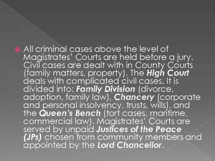 All criminal cases above the level of Magistrates’ Courts are held before a jury. Civil cases are dealt with in County Courts (family matters, property). The High Court deals with complicated civil cases. It is divided into: Family Division (divorce, adoption, family law), Chancery (corporate and personal insolvency, trusts, wills), and the Queen’s Bench (tort cases, maritime, commercial law). Magistrates’ Courts are served by unpaid Justices of the Peace (JPs) chosen from community members and appointed by the Lord Chancellor.