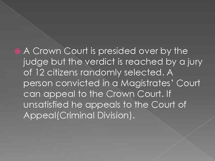 A Crown Court is presided over by the judge but the verdict is reached by a jury of 12 citizens randomly selected. A person convicted in a Magistrates’ Court can appeal to the Crown Court. If unsatisfied he appeals to the Court of Appeal(Criminal Division).