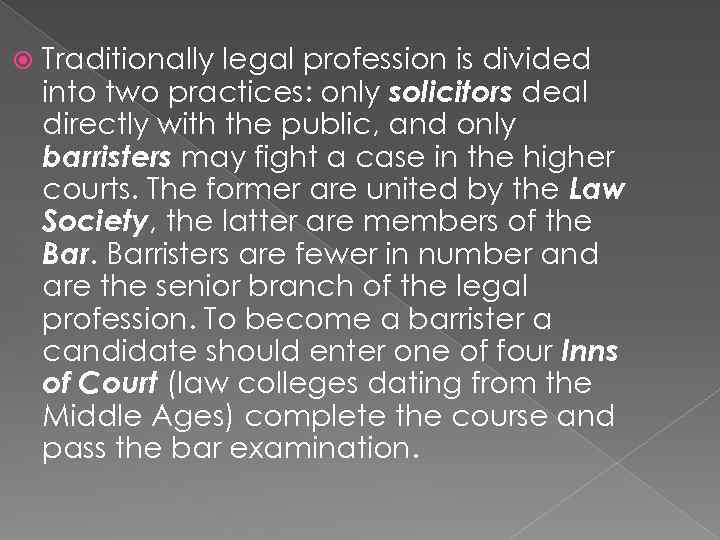 Traditionally legal profession is divided into two practices: only solicitors deal directly with the public, and only barristers may fight a case in the higher courts. The former are united by the Law Society, the latter are members of the Barristers are fewer in number and are the senior branch of the legal profession. To become a barrister a candidate should enter one of four Inns of Court (law colleges dating from the Middle Ages) complete the course and pass the bar examination.