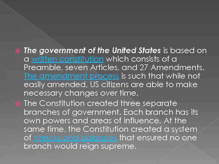 The government of the United States is based on a written constitution which consists of a Preamble, seven Articles, and 27 Amendments. The amendment process is such that while not easily amended, US citizens are able to make necessary changes over time. The Constitution created three separate branches of government. Each branch has its own powers and areas of influence. At the same time, the Constitution created a system of checks and balances that ensured no one branch would reign supreme.