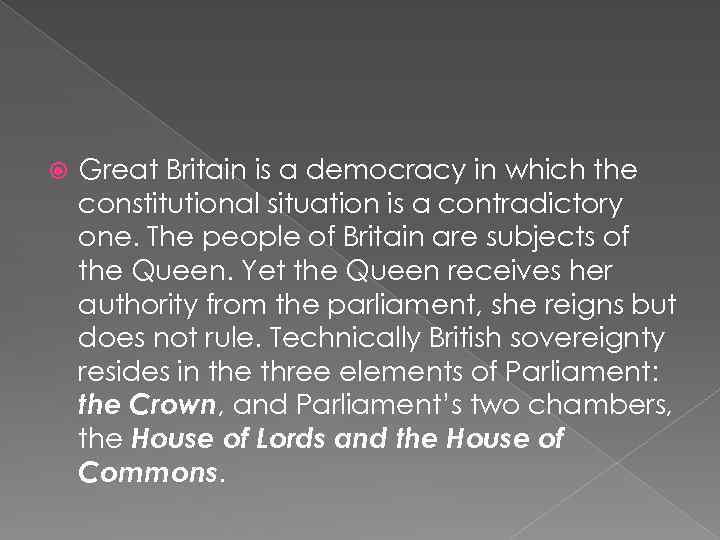 Great Britain is a democracy in which the constitutional situation is a contradictory one. The people of Britain are subjects of the Queen. Yet the Queen receives her authority from the parliament, she reigns but does not rule. Technically British sovereignty resides in the three elements of Parliament: the Crown, and Parliament’s two chambers, the House of Lords and the House of Commons.