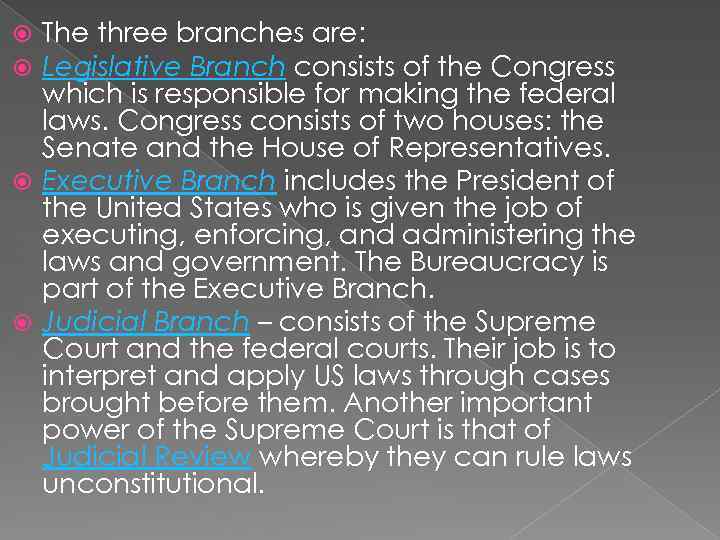 The three branches are: Legislative Branch consists of the Congress which is responsible for making the federal laws. Congress consists of two houses: the Senate and the House of Representatives. Executive Branch includes the President of the United States who is given the job of executing, enforcing, and administering the laws and government. The Bureaucracy is part of the Executive Branch. Judicial Branch – consists of the Supreme Court and the federal courts. Their job is to interpret and apply US laws through cases brought before them. Another important power of the Supreme Court is that of Judicial Review whereby they can rule laws unconstitutional.