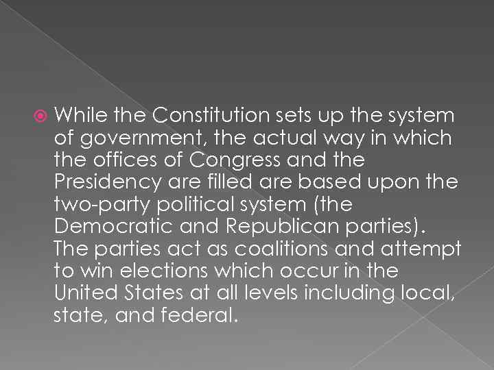 While the Constitution sets up the system of government, the actual way in which the offices of Congress and the Presidency are filled are based upon the two-party political system (the Democratic and Republican parties). The parties act as coalitions and attempt to win elections which occur in the United States at all levels including local, state, and federal.