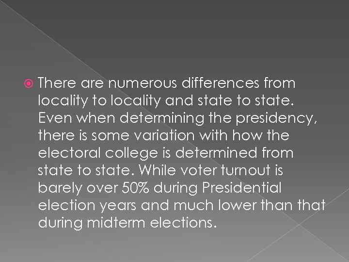 There are numerous differences from locality to locality and state to state. Even when determining the presidency, there is some variation with how the electoral college is determined from state to state. While voter turnout is barely over 50% during Presidential election years and much lower than that during midterm elections.