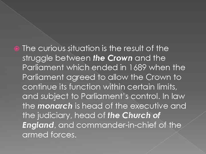 The curious situation is the result of the struggle between the Crown and the Parliament which ended in 1689 when the Parliament agreed to allow the Crown to continue its function within certain limits, and subject to Parliament’s control. In law the monarch is head of the executive and the judiciary, head of the Church of England, and commander-in-chief of the armed forces.