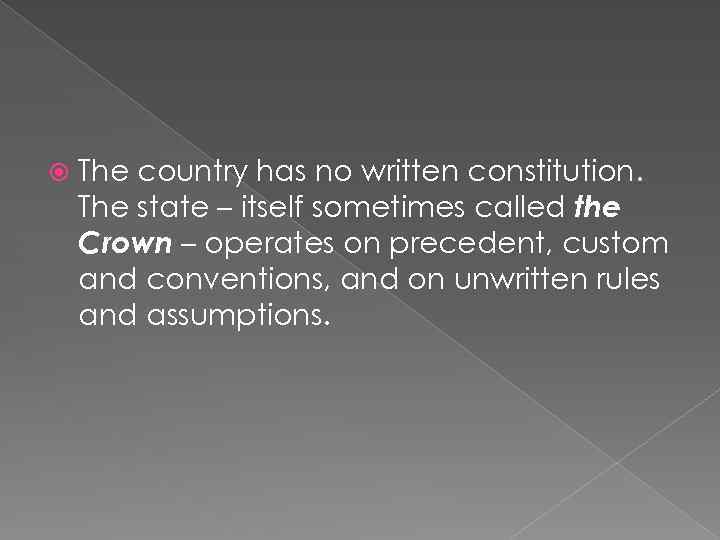The country has no written constitution. The state – itself sometimes called the Crown – operates on precedent, custom and conventions, and on unwritten rules and assumptions.
