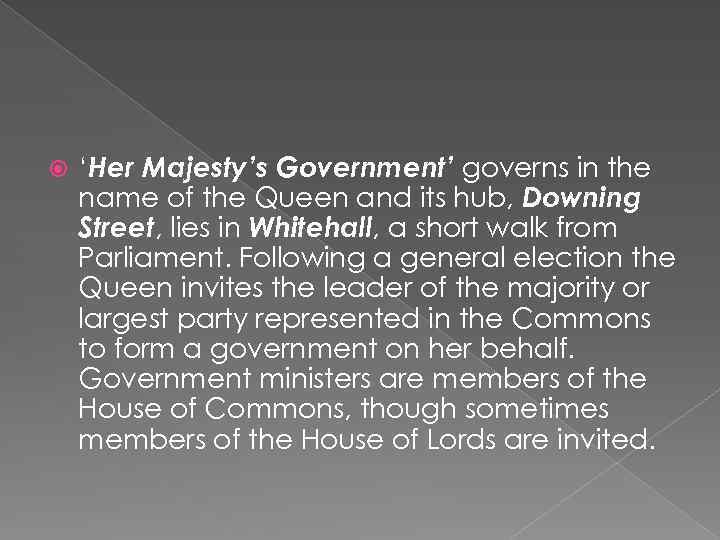 ‘Her Majesty’s Government’ governs in the name of the Queen and its hub, Downing Street, lies in Whitehall, a short walk from Parliament. Following a general election the Queen invites the leader of the majority or largest party represented in the Commons to form a government on her behalf. Government ministers are members of the House of Commons, though sometimes members of the House of Lords are invited.