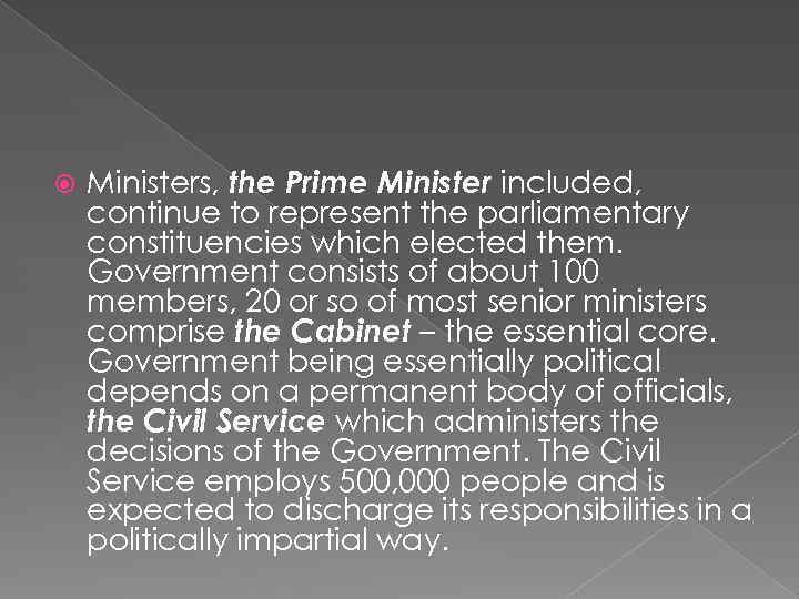 Ministers, the Prime Minister included, continue to represent the parliamentary constituencies which elected them. Government consists of about 100 members, 20 or so of most senior ministers comprise the Cabinet – the essential core. Government being essentially political depends on a permanent body of officials, the Civil Service which administers the decisions of the Government. The Civil Service employs 500, 000 people and is expected to discharge its responsibilities in a politically impartial way.