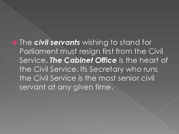 The civil servants wishing to stand for Parliament must resign first from the Civil Service. The Cabinet Office is the heart of the Civil Service. Its Secretary who runs the Civil Service is the most senior civil servant at any given time.