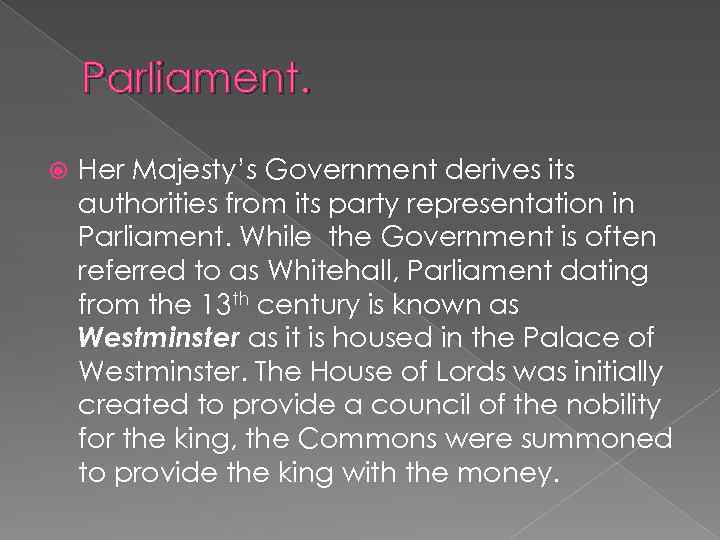 Parliament. Her Majesty’s Government derives its authorities from its party representation in Parliament. While the Government is often referred to as Whitehall, Parliament dating from the 13 th century is known as Westminster as it is housed in the Palace of Westminster. The House of Lords was initially created to provide a council of the nobility for the king, the Commons were summoned to provide the king with the money.