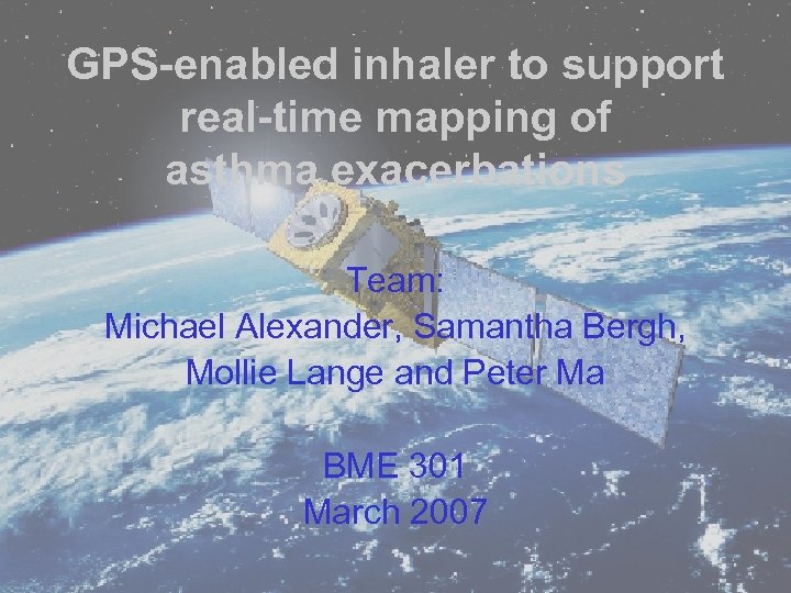 GPS-enabled inhaler to support real-time mapping of asthma exacerbations Team: Michael Alexander, Samantha Bergh, Mollie Lange and Peter Ma BME 301 March 2007