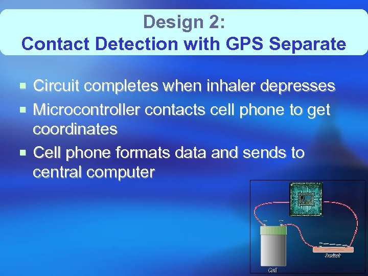 Design 2: Contact Detection with GPS Separate ¡ Circuit completes when inhaler depresses ¡ Microcontroller contacts cell phone to get coordinates ¡ Cell phone formats data and sends to central computer