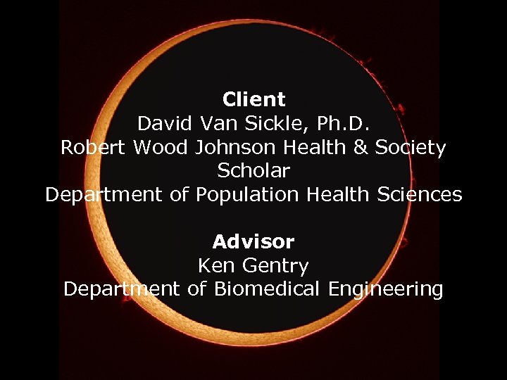 Client David Van Sickle, Ph. D. Robert Wood Johnson Health & Society Scholar Department of Population Health Sciences Advisor Ken Gentry Department of Biomedical Engineering