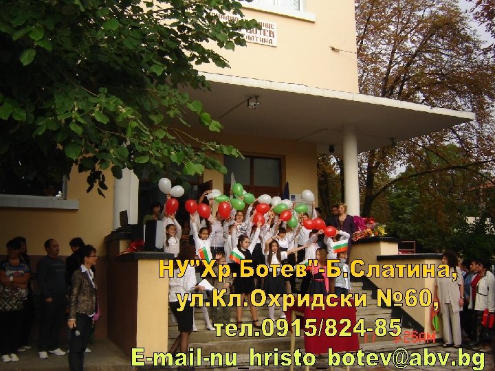 НУ”ХРИСТО БОТЕВ”-БЯЛА СЛАТИНА ОБЯВЯВА ПРИЕМ ЗА УЧЕНИЦИ ОТ І-ви клас за УЧЕБНАТА 2013 -2014 г. -ТРИ ПАРАЛЕЛКИ Ред и график на дейностите по приема и записването на ученици в първи клас в НУ„Христо Ботев” град Бяла Слатина, за учебната 2013 -2014 г. : ♦Приемът и записването на ученици в І-ви клас в НУ „Хр. Ботев” -Б. Слатина, за учебната 2013 -2014 г. се организира при спазване разпоредбите на нормативната уредба и приетите с решение на ПС срокове. Прием на документите, необходими за записване на учениците в І-ви клас, за времето от 30. 04. 2013 год. До 07. 06. 2013 година : - Молба /заявление от родителя-настойника на детето по образец на учелището; - Акт за раждане на детето; - Удостоверение за училищна готовност - оригинал ♦Преглед на подадените от родителите на бъдещите първокласници комплект документи от комисия за установяване спазването на изисквания за цялостност на комплекта документи и спазени срокове за подаването им. Срок: 10. 06. 2013 г. ♦Изготвяне на окончателен списък на приетите деца за ученици в първи клас в НУ”Хр. Ботев”Б. Слатина за учебната 2013 -2014 г. ♦Утвърждаване на списъка от директора. ♦Изнасяне на окончателния списък на приетите за ученици в първи клас в НУ”Хр. Ботев”-Б. Слатина за учебната 2013 -2014 г. на информационното табло на І-ия етаж на училищната сграда за информация на заинтересованите лица. Записването на ученици в първи клас в НУ”Хр. Ботев”-Б. Слатина за учебната 2013/2014 г. се извършва от родителите/настойници в деловодството на училището (на І-ия етаж, стая 1) срок от 10. 06. 2013 год. До 21. 06. 2013 година : За допълнителна информация – тел. 0915/924 -85