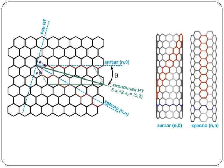 Виды хиральности: 1. Ахиральные типа «кресла» . Две стороны каждого шестиугольника ориентированы перпендикулярно оси УНТ, индексы (n, n). 2. Ахиральные типа «зигзаг» . Две стороны каждого шестиугольника ориентированы параллельно оси УНТ, индексы (n, 0). 3. Хиральные или спиралевидные. Каждая сторона шестиугольника расположена к оси УНТ под углом, отличным от 0 и 90º, индексы (n, m).