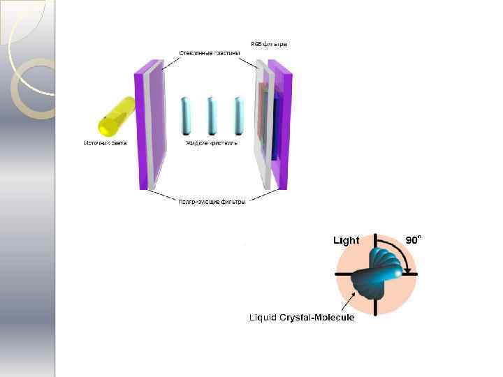Устройство Работа ЖКД основана на явлении поляризации светового потока. Известно, что так называемые кристаллы поляроиды способны пропускать только ту составляющую света, вектор электромагнитной индукции которой лежит в плоскости, параллельной оптической плоскости поляроида. Для оставшейся части светового потока поляроид будет непрозрачным.
