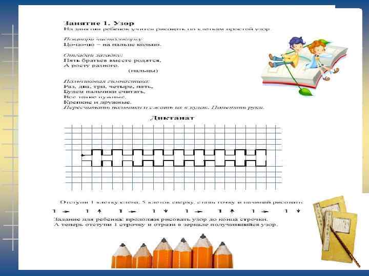 Графический диктант можно выполнять в двух вариантах: 1. Ребенку предлагают образец геометрического рисунка и просят его повторить точно такой же рисунок в тетради в клетку. 2. Взрослый диктует последовательность действий с указанием числа клеточек и их направлений (влево, вправо, вверх, вниз), ребенок выполняет работу на слух, а затем сравнивает методом наложения свое изображение орнамента или фигуры с образцом в пособии.