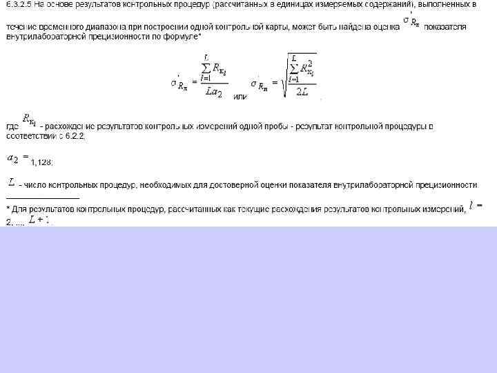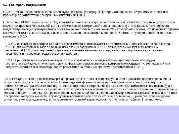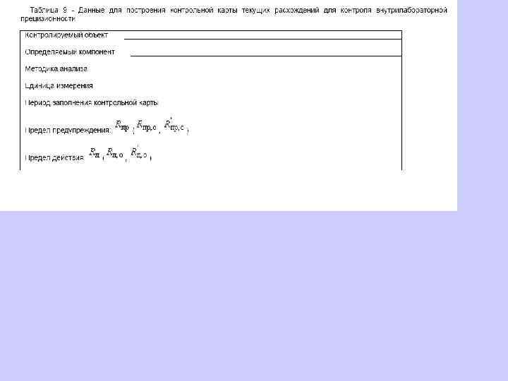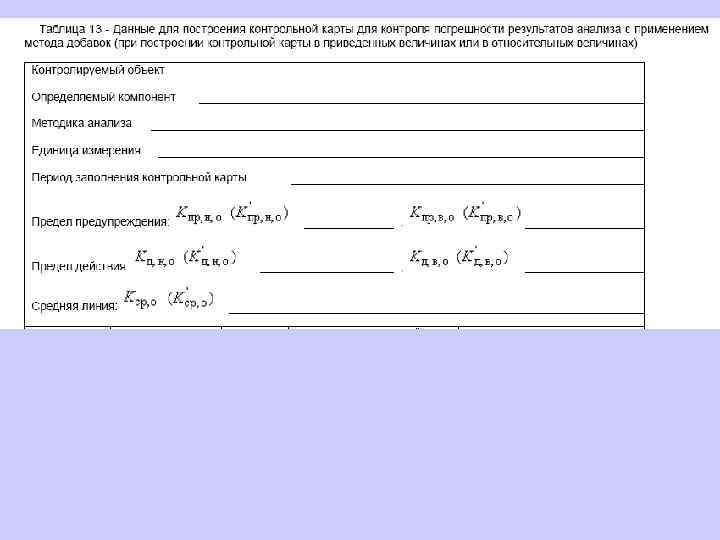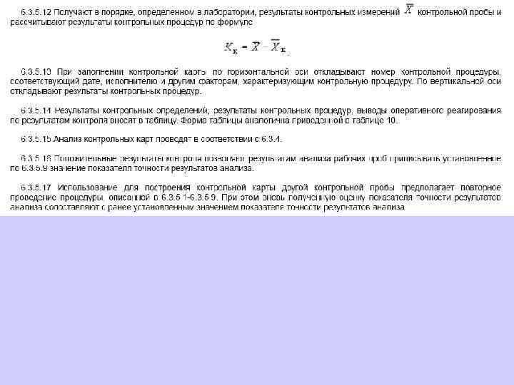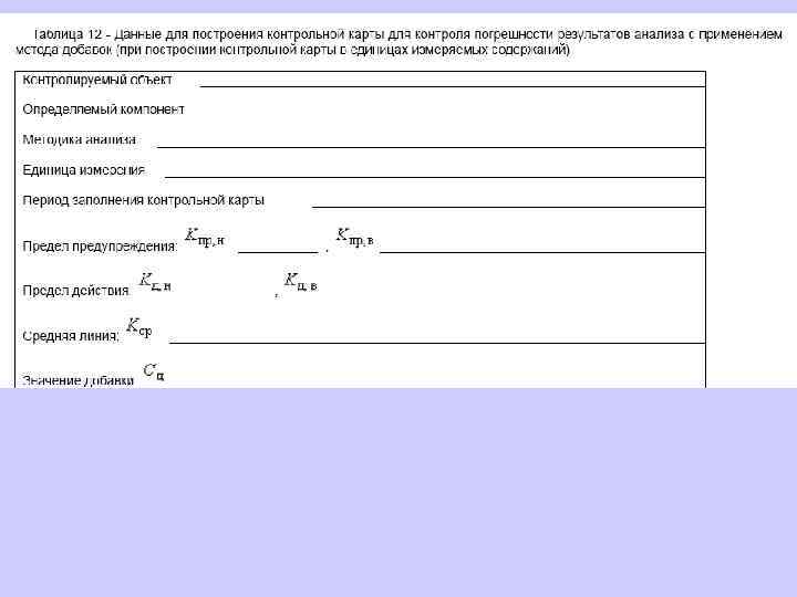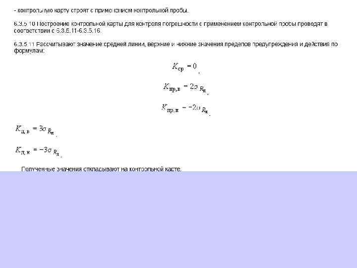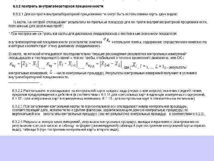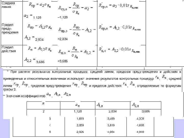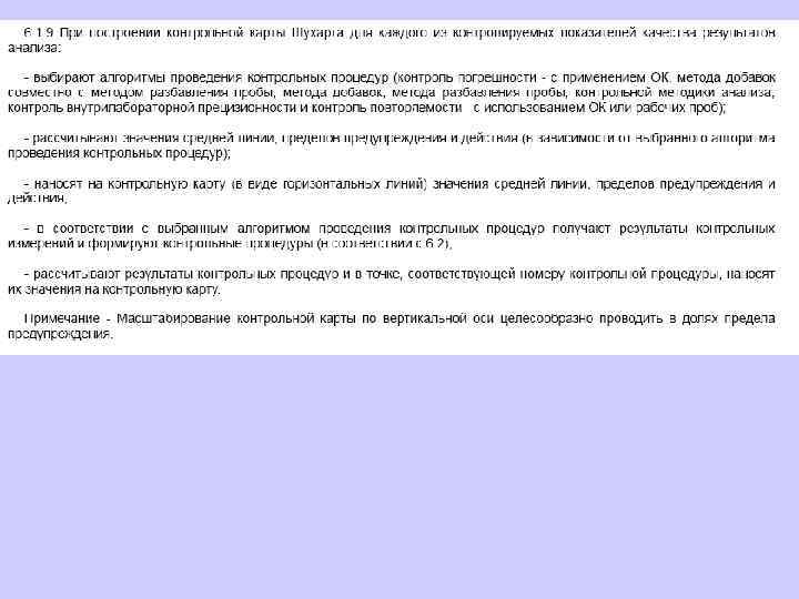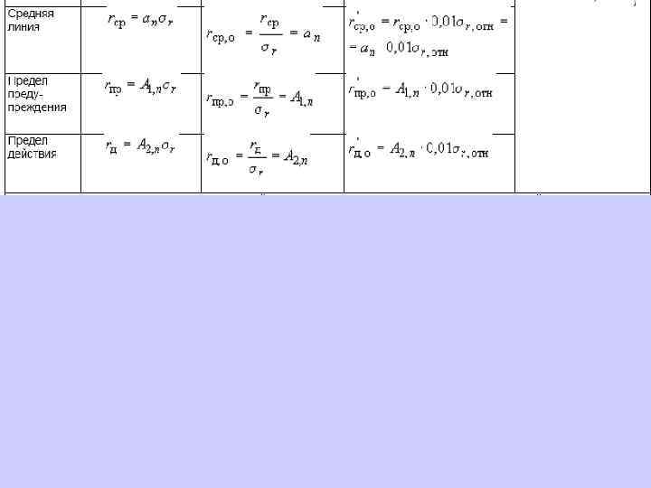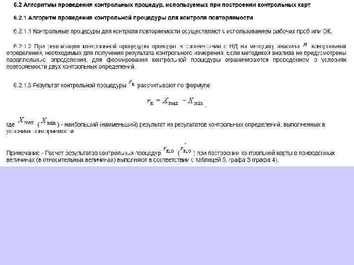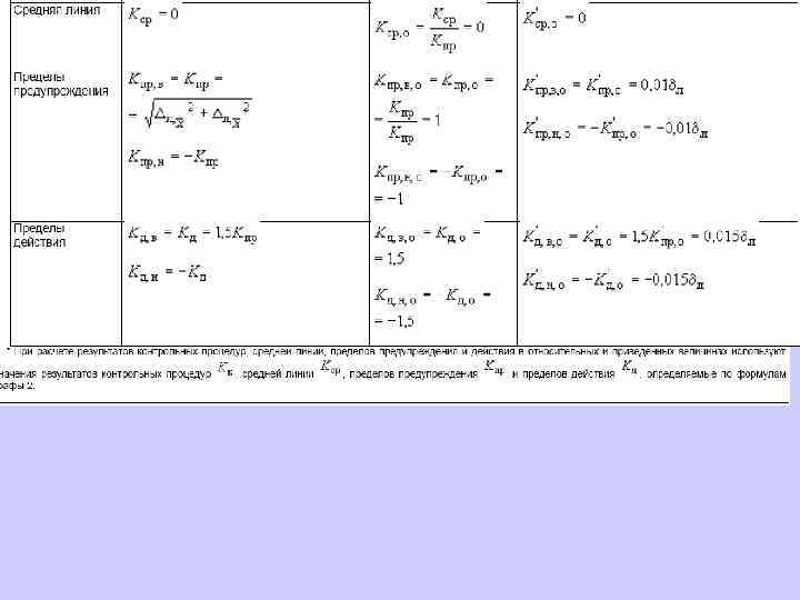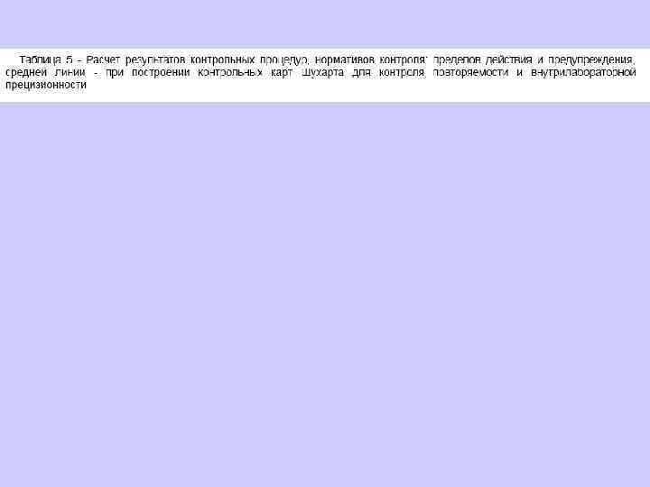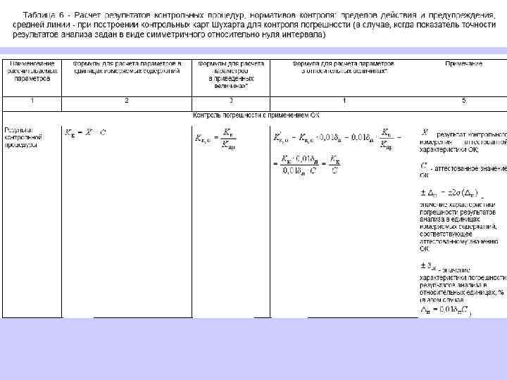 6. 1. 13. 2 Значения средней линии, пределов предупреждения, пределов действия, результатов контрольных процедур рассчитывают, используя их значения в приведенных величинах (графы 3 таблиц 5 и 6), умноженные на значения контролируемого показателя качества (точности, внутрилабораторной прецизионности, повторяемости) в относительных единицах. 6. 1. 13. 3 При построении контрольной карты расчет значений средней линии, пределов предупреждения, пределов действия, результатов контрольных процедур осуществляют: при контроле повторяемости и внутрилабораторной прецизионности - в соответствии с таблицей 5 (графа 4); при контроле погрешности - в соответствии с таблицей 6 (графа 4).
