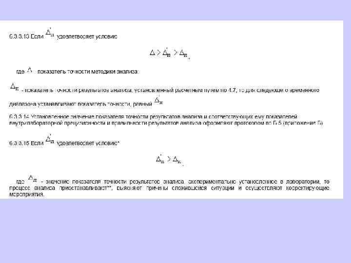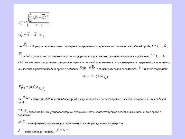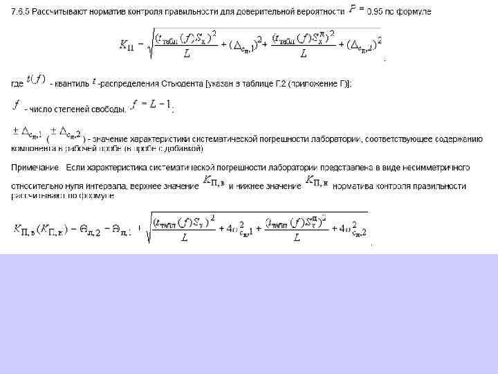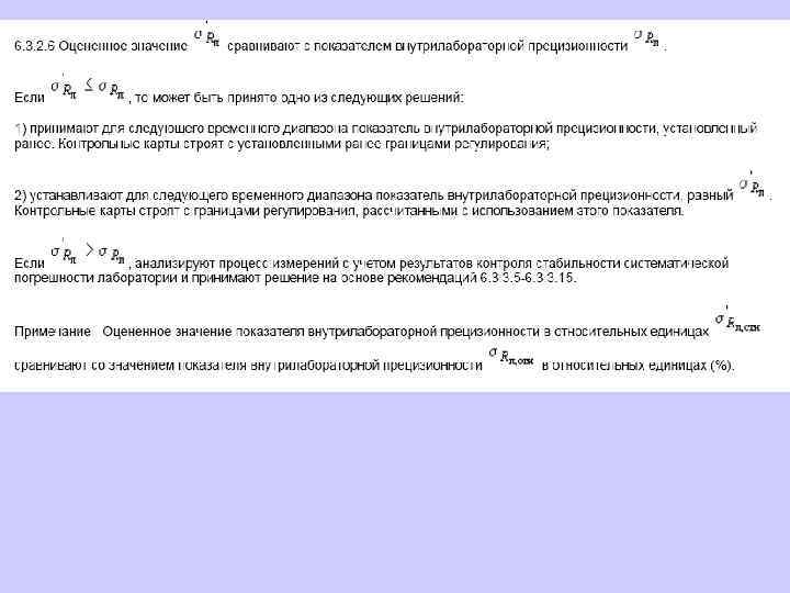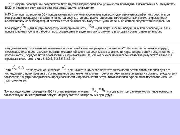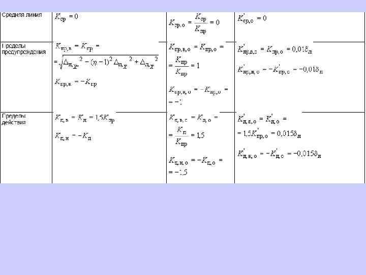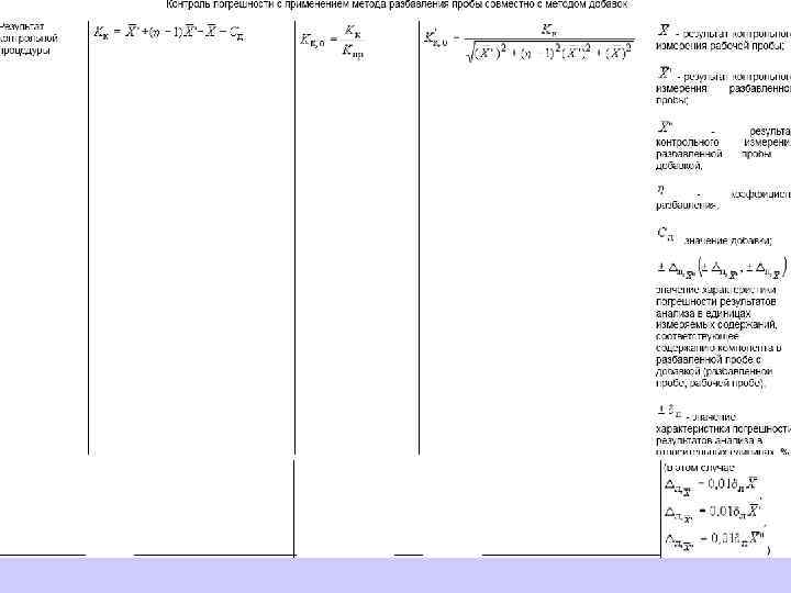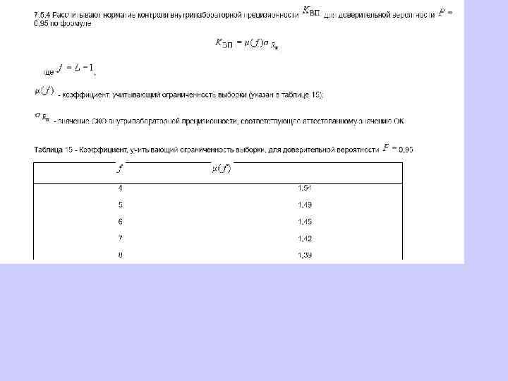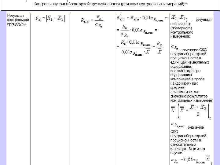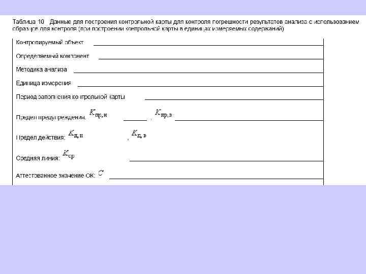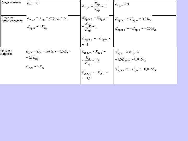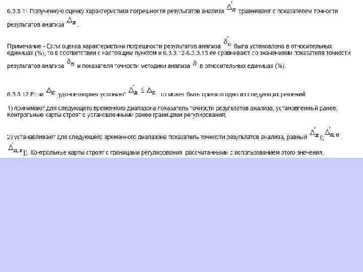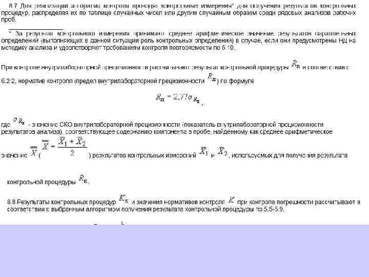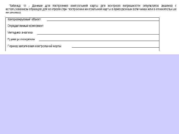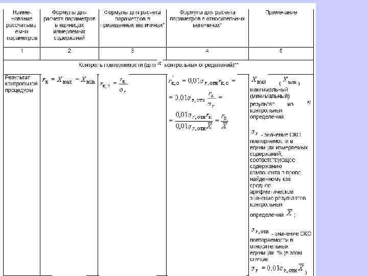 6. 1. 13. 2 Значения средней линии, пределов предупреждения, пределов действия, результатов контрольных процедур рассчитывают, используя их значения в приведенных величинах (графы 3 таблиц 5 и 6), умноженные на значения контролируемого показателя качества (точности, внутрилабораторной прецизионности, повторяемости) в относительных единицах. 6. 1. 13. 3 При построении контрольной карты расчет значений средней линии, пределов предупреждения, пределов действия, результатов контрольных процедур осуществляют: при контроле повторяемости и внутрилабораторной прецизионности - в соответствии с таблицей 5 (графа 4); при контроле погрешности - в соответствии с таблицей 6 (графа 4).