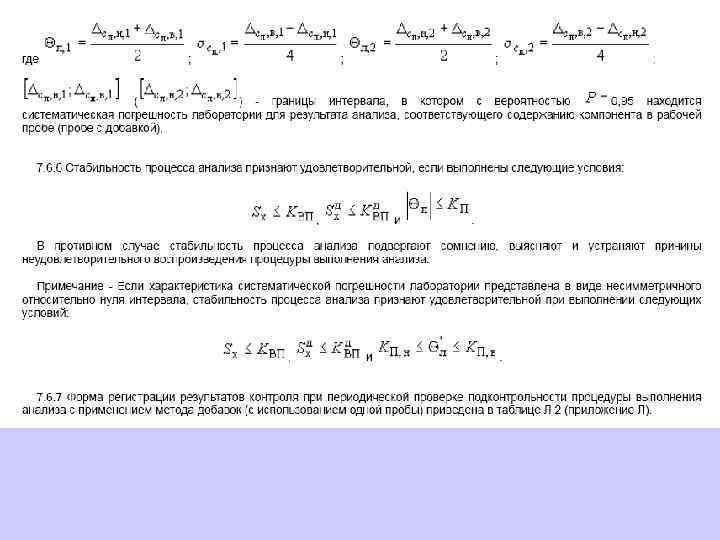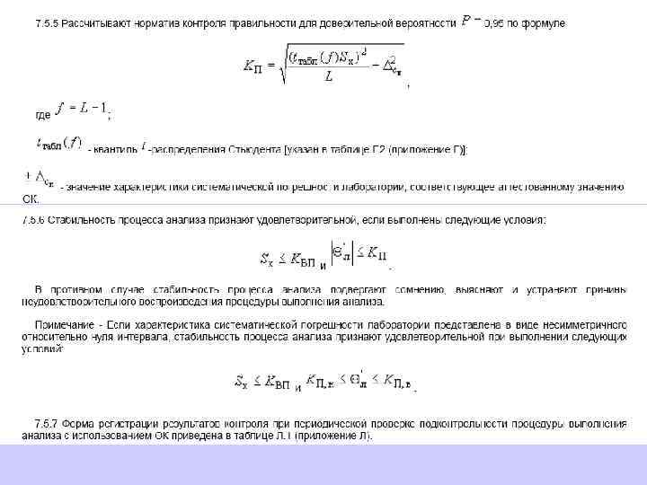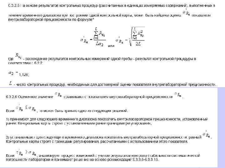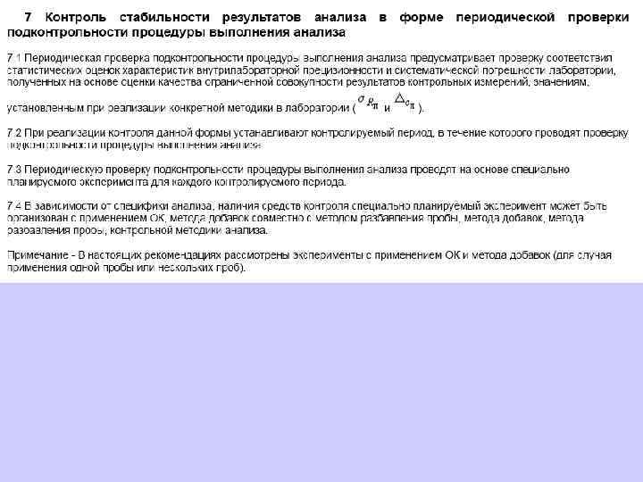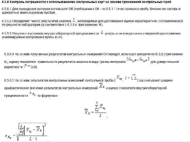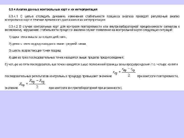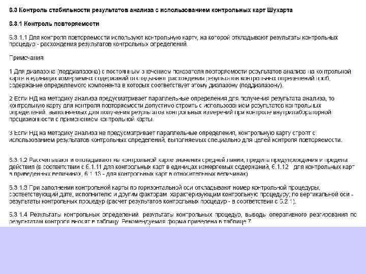 В целях обеспечения стабильности результатов анализа и принятия оперативных мер по управлению процессом анализа одновременно и регулярно строят контрольные карты для контроля показателей повторяемости, внутрилабораторной прецизионности, погрешности результатов анализа.