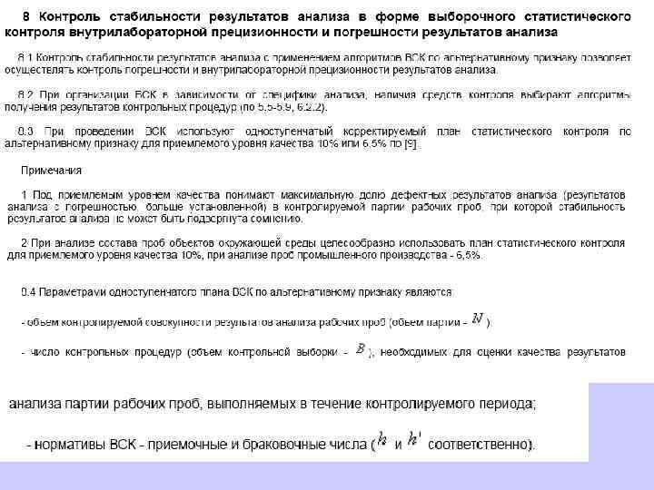 Для организации контроля стабильности результатов анализа с использованием контрольных карт определяют: - необходимое число контрольных процедур для достоверной оценки каждого из контролируемых показателей качества результатов анализа (с учетом принятых значений неопределенности оценок характеристик этих показателей* согласно приложению Ж); - временной диапазон для получения необходимого числа контрольных процедур (далее - временной диапазон), устанавливаемый с учетом: длительности процедуры выполнения анализа, стоимости анализа, взаимосвязи числа контрольных процедур с числом рабочих проб, анализируемых за определенный период времени. * Оценку характеристики контролируемого показателя качества считают достоверной, если неопределенность этой оценки не превышает 0, 33.