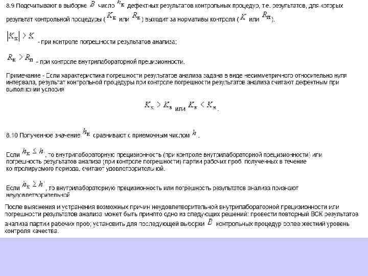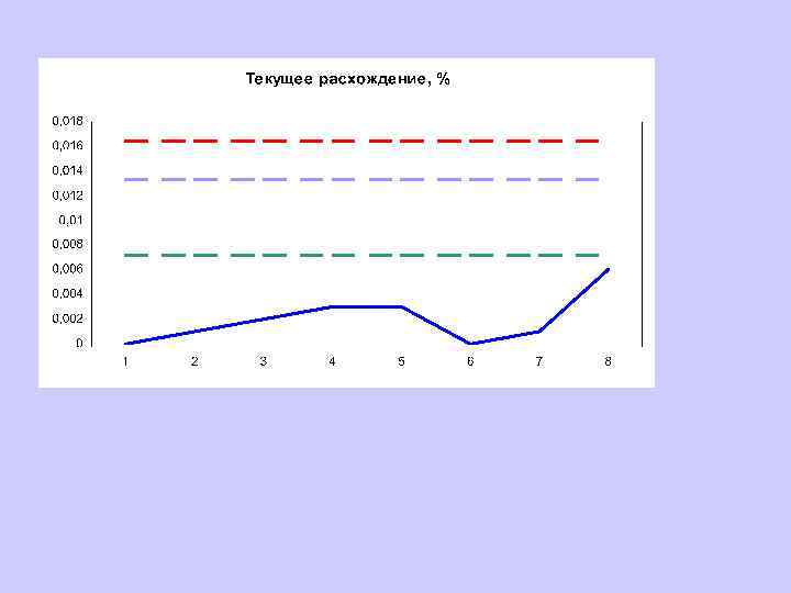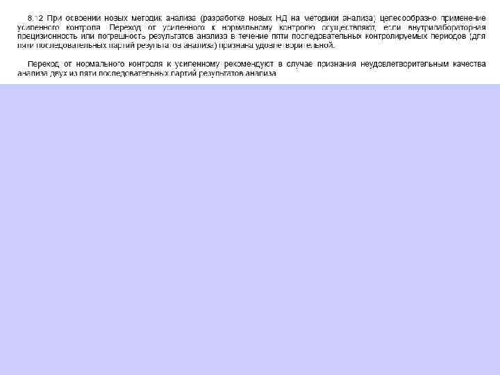 В качестве «тревожных признаков» используются следующие правила: ü 1(2σ) – последняя точка лежит выше контрольного предела или ниже контрольного предела . Этот признак используется в ГОСТ Р ИСО 5725 -6 -2002; ü 2(1σ) - две или три последовательных точки, включая последнюю, лежат выше контрольного предела или ниже контрольного предела ; ü - семь или более последовательных точек, включая 7 последнюю, лежат выше (или ниже) среднего значения ; ü 4 D - каждая из четырех и более последовательных точек, включая последнюю, лежит выше (положительный дрейф) или ниже (отрицательный дрейф) предыдущей. Появление любого из этих признаков указывает на возможность выхода процесса измерений из-под контроля.