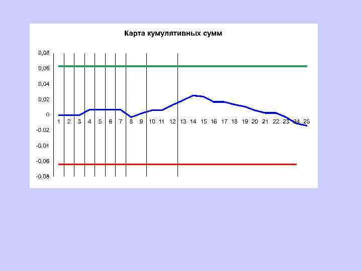 На контрольной карте кумулятивных сумм (CUSUM) по вертикали откладывают кумулятивные суммы Сi. Их рассчитывают по формулам На контрольной карте CUSUM ось Х соответствует нулевому значению. Таким образом, каждая точка карты CUSUM представляет собой сумму отклонения текущего результата измерения (среднего значения в серии) от среднего и всех предыдущих отклонений. Отклонение от общего среднего "накапливается", что и дало название этому виду контрольных карт.