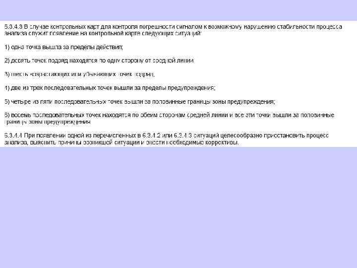 В ГОСТ Р ИСО 5725 -6 -2002 рассматриваются два вида событий, свидетельствующих о нестабильности процесса измерений: превышение «предела предупреждения» и превышение «предела действия» .