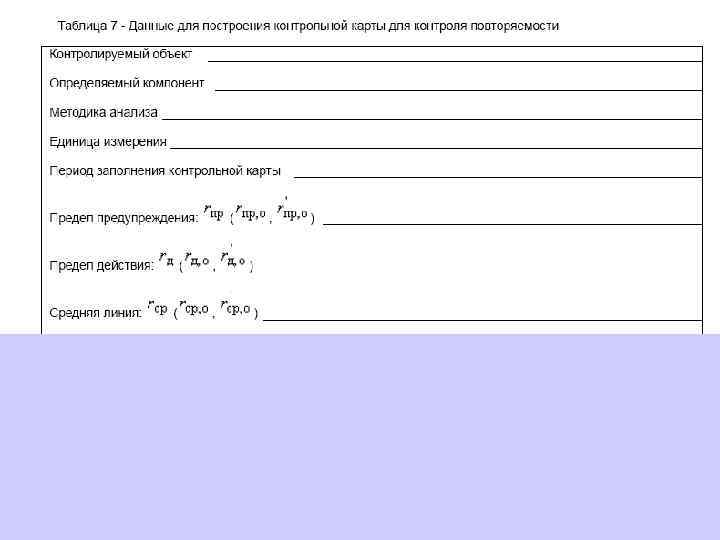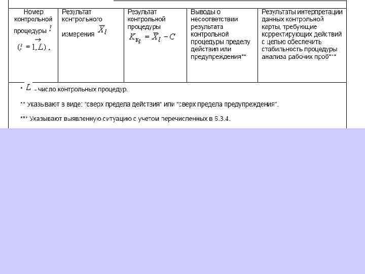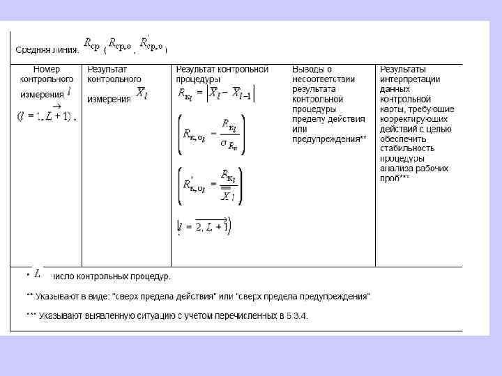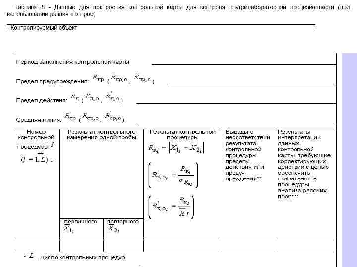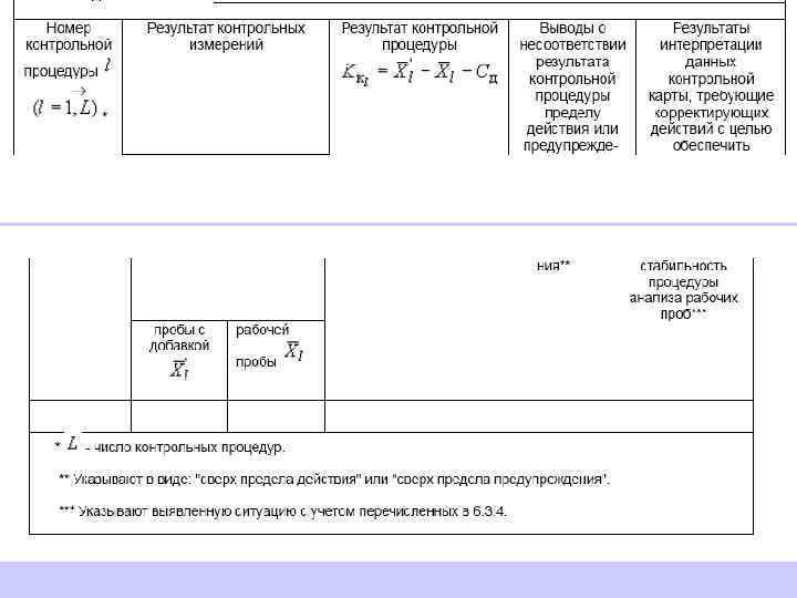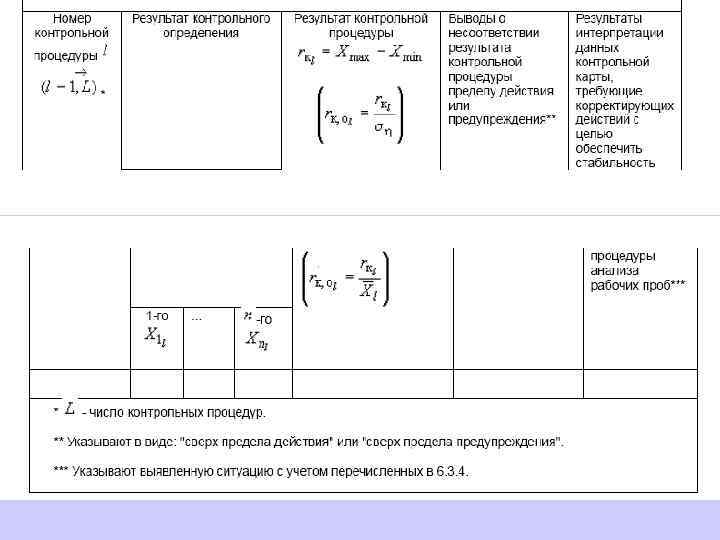 При построении контрольной карты расчет значений средней линии, пределов предупреждения, пределов действия, результатов контрольных процедур осуществляют: при контроле повторяемости и внутрилабораторной прецизионности - в соответствии с таблицей 5 (графа 3); при контроле погрешности - в соответствии с таблицей 6 (графа 3)*.