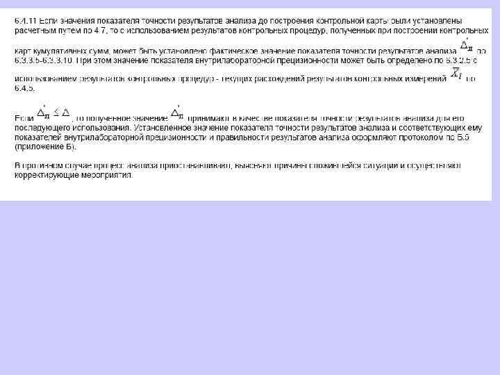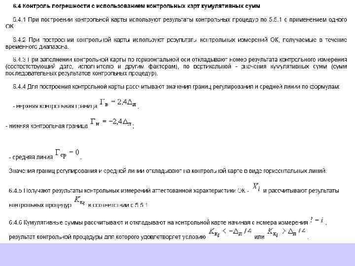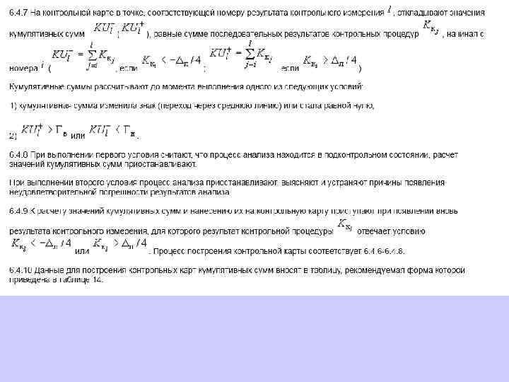 Построение контрольной карты кумулятивных сумм При построении контрольной карты применяют алгоритм проведения контрольной процедуры для контроля погрешности с использованием ОК. Контрольную карту кумулятивных сумм допустимо строить в привязке к началу и концу диапазона анализа рабочих проб (если показатель точности результатов анализа установлен в виде линейной зависимости от содержания определяемого компонента или в виде постоянного значения в относительных единицах для всего диапазона анализа рабочих проб) или в привязке к началу, середине и концу диапазона анализа (если показатель точности результатов анализа установлен в виде постоянных значений в единицах измеряемых содержаний для всех поддиапазонов диапазона анализа рабочих проб). При построении контрольной карты расчет значений средней линии, границ регулирования осуществляют в соответствии с 6. 4. 4, результатов контрольных процедур - в соответствии с 5. 5. 1.