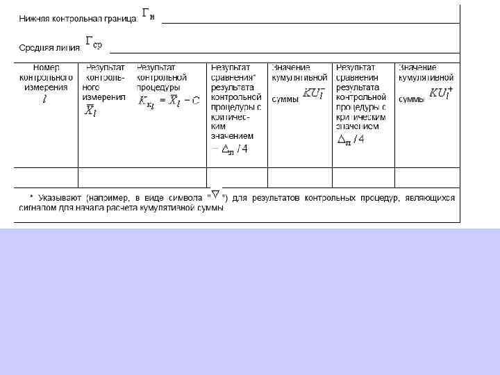 Применение контрольных карт Шухарта основано на сопоставлении результатов контрольных процедур с установленными нормативами контроля: пределами действия (устанавливаемыми для доверительной вероятности 0, 997) и пределами предупреждения (устанавливаемыми для доверительной вероятности 0, 95) Применение контрольных карт кумулятивных сумм основано на сопоставлении сумм результатов последовательных контрольных процедур с нормативами контроля границами регулирования