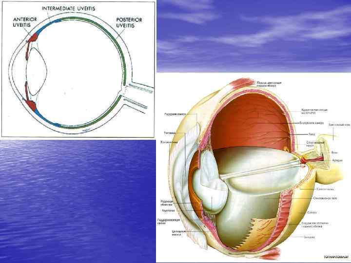 Классификация воспалительных заболеваний сосудистого тракта (по клиническим особенностям) • Передний увеит (ирит и иридоциклит)- воспаление радужки и цилиарного тела • Задний увеит (хориоидит)- воспаление хориоидеи • Периферический увеит – воспаление плоской части цилиарного тела и крайней периферии хориоидеи • Панувеит – воспаление всех отделов сосудистого тракта