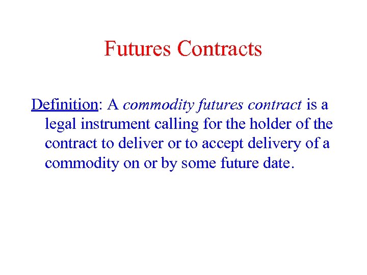 Futures Contracts Definition: A commodity futures contract is a legal instrument calling for the holder of the contract to deliver or to accept delivery of a commodity on or by some future date.