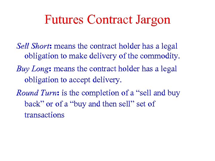 Futures Contract Jargon Sell Short: means the contract holder has a legal Short obligation to make delivery of the commodity. Buy Long: means the contract holder has a legal Long obligation to accept delivery. Round Turn: is the completion of a “sell and buy Turn back” or of a “buy and then sell” set of transactions