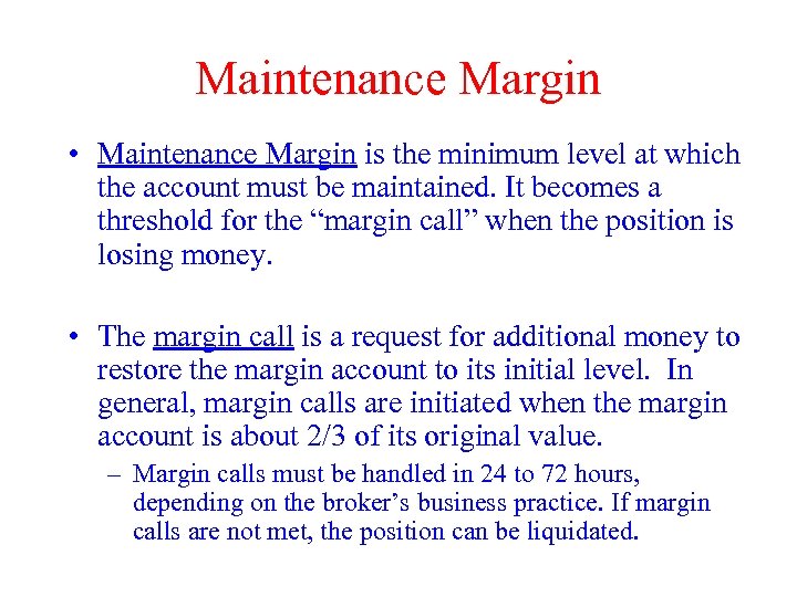 Maintenance Margin • Maintenance Margin is the minimum level at which the account must be maintained. It becomes a threshold for the “margin call” when the position is losing money. • The margin call is a request for additional money to restore the margin account to its initial level. In general, margin calls are initiated when the margin account is about 2/3 of its original value. – Margin calls must be handled in 24 to 72 hours, depending on the broker’s business practice. If margin calls are not met, the position can be liquidated.