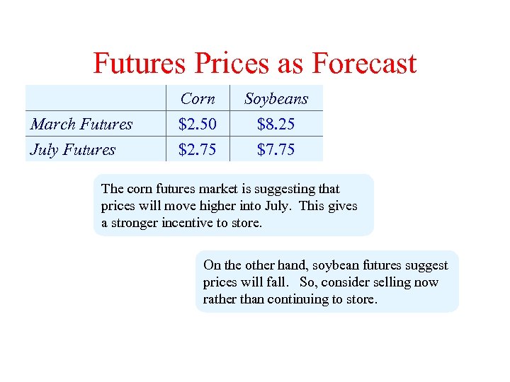 Futures Prices as Forecast March Futures July Futures Corn $2. 50 $2. 75 Soybeans $8. 25 $7. 75 The corn futures market is suggesting that prices will move higher into July. This gives a stronger incentive to store. On the other hand, soybean futures suggest prices will fall. So, consider selling now rather than continuing to store.
