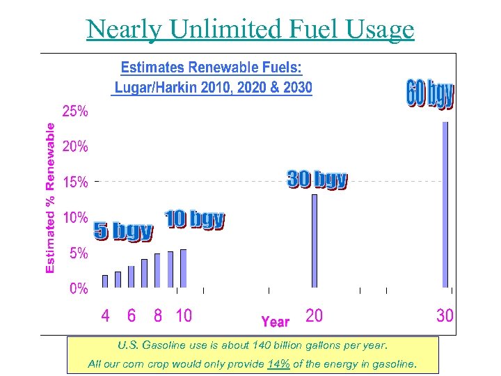 Nearly Unlimited Fuel Usage U. S. Gasoline use is about 140 billion gallons per year. All our corn crop would only provide 14% of the energy in gasoline.