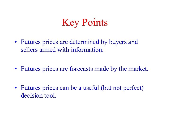 Key Points • Futures prices are determined by buyers and sellers armed with information. • Futures prices are forecasts made by the market. • Futures prices can be a useful (but not perfect) decision tool.