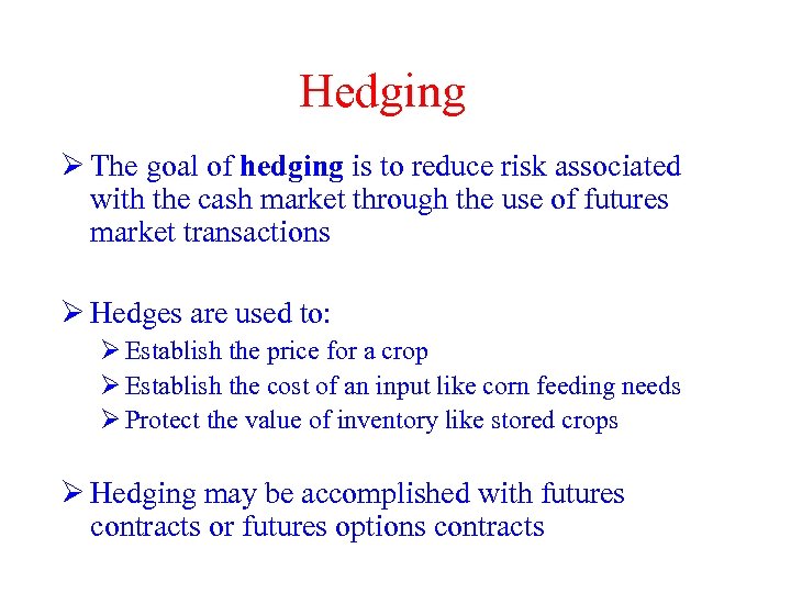 Hedging Ø The goal of hedging is to reduce risk associated with the cash market through the use of futures market transactions Ø Hedges are used to: Ø Establish the price for a crop Ø Establish the cost of an input like corn feeding needs Ø Protect the value of inventory like stored crops Ø Hedging may be accomplished with futures contracts or futures options contracts