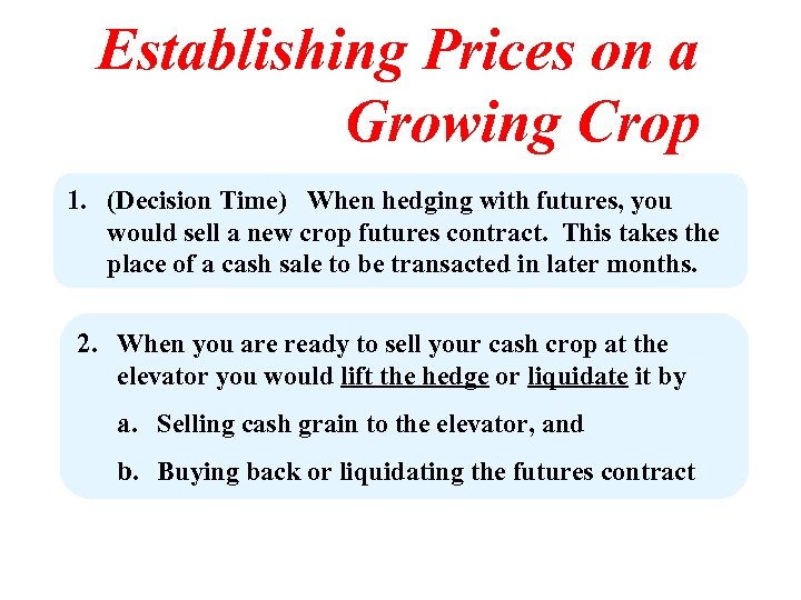 Establishing Prices on a Growing Crop 1. (Decision Time) When hedging with futures, you would sell a new crop futures contract. This takes the place of a cash sale to be transacted in later months. 2. When you are ready to sell your cash crop at the elevator you would lift the hedge or liquidate it by a. Selling cash grain to the elevator, and b. Buying back or liquidating the futures contract