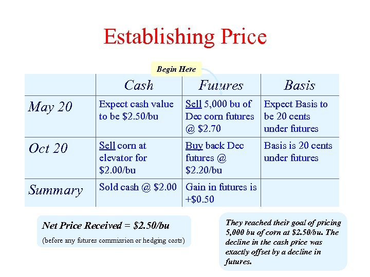 Establishing Price Begin Here Cash Futures Basis May 20 Expect cash value to be $2. 50/bu Sell 5, 000 bu of Expect Basis to Dec corn futures be 20 cents @ $2. 70 under futures Oct 20 Sell corn at elevator for $2. 00/bu Buy back Dec futures @ $2. 20/bu Summary Sold cash @ $2. 00 Gain in futures is +$0. 50 Net Price Received = $2. 50/bu (before any futures commission or hedging costs) Basis is 20 cents under futures They reached their goal of pricing 5, 000 bu of corn at $2. 50/bu. The decline in the cash price was exactly offset by a decline in futures.