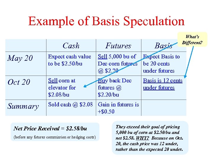 The Answer: Cash Futures Basis May 20 Expect cash value to be $2. 50/bu Sell 5, 000 bu of Expect Basis to Dec corn futures be 20 cents @ $2. 70 under futures Oct 20 Sell corn at elevator for $3. 20/bu Buy back Dec futures @ $3. 40/bu Summary Sold cash @ $3. 20 Loss in futures is -$0. 70 Net Price Received = $2. 50/bu (before any futures commission or hedging costs) Basis is 20 cents under futures They reached their goal of pricing 5, 000 bu of corn at $2. 50/bu. The increase in the cash price was exactly offset by a increase in futures.