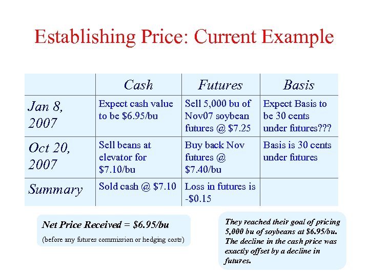 Establishing Price: Current Example Cash Futures Basis Jan 8, 2007 Expect cash value to be $6. 95/bu Sell 5, 000 bu of Nov 07 soybean futures @ $7. 25 Expect Basis to be 30 cents under futures? ? ? Oct 20, 2007 Sell beans at elevator for $7. 10/bu Buy back Nov futures @ $7. 40/bu Basis is 30 cents under futures Summary Sold cash @ $7. 10 Loss in futures is -$0. 15 Net Price Received = $6. 95/bu (before any futures commission or hedging costs) They reached their goal of pricing 5, 000 bu of soybeans at $6. 95/bu. The decline in the cash price was exactly offset by a decline in futures.