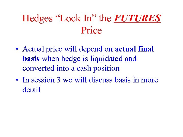 Hedges “Lock In” the FUTURES Price • Actual price will depend on actual final basis when hedge is liquidated and converted into a cash position • In session 3 we will discuss basis in more detail