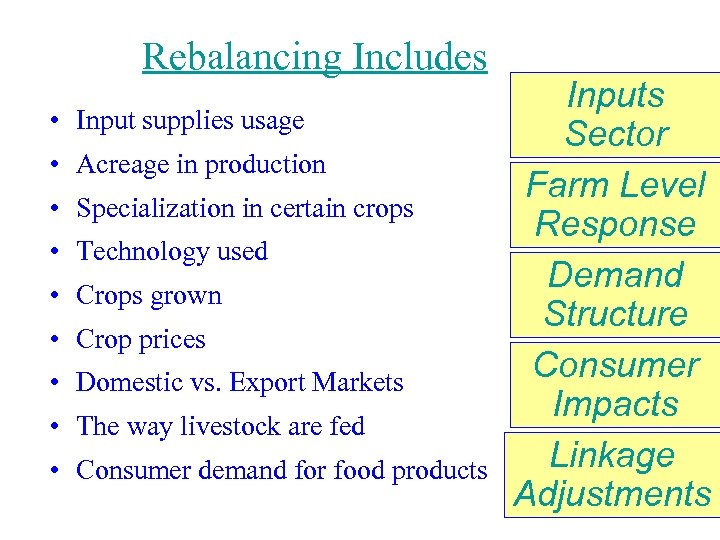 Rebalancing Includes • Input supplies usage • Acreage in production • Specialization in certain crops • Technology used • Crops grown • Crop prices • Domestic vs. Export Markets • The way livestock are fed • Consumer demand for food products Inputs Sector Farm Level Response Demand Structure Consumer Impacts Linkage Adjustments
